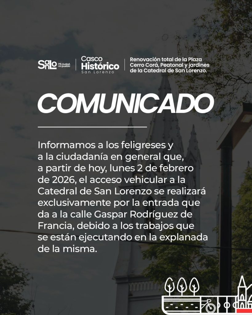 La Municipalidad local anunció que desde hoy «el acceso vehicular a la Catedral de San Lorenzo se realizará exclusivamente por la entrada que da a la calle Gaspar Rodríguez de Francia, debido a los trabajos que se están ejecutando en la explanada de la misma».