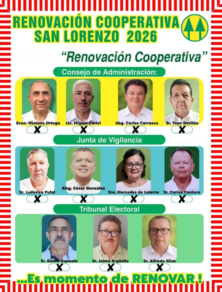 La emblemática Cooperativa San Lorenzo renovará parcialmente a sus autoridades del Consejo de Administración, Junta de Vigilancia y Tribunal Electoral. Dos movimientos se presentan para enfrentar al movimiento oficialista, liderado por el cuestionado concejal municipal y actual presidente del ente, Alcibíades Quiñonez.