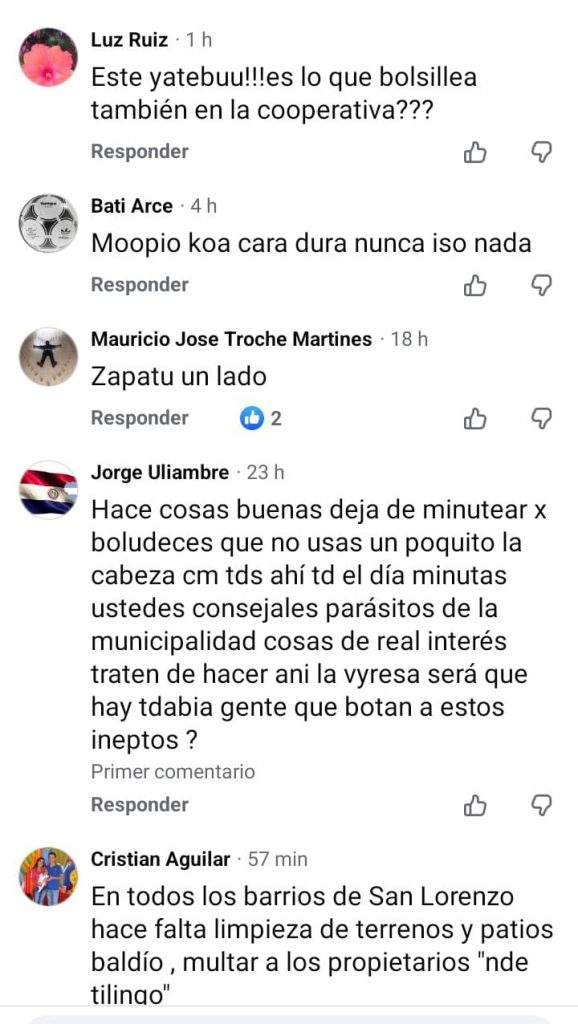 El concejal Alcibíades Quiñonez (ANR-HC/A) recibió escraches luego de un posteo de la Junta Municipal, que había informado sobre una minuta del concejal, solicitando la «limpieza de los terrenos ubicados sobre Gallardo León y Nicolás Bo del Barrio Los Nogales (sic)». La reacción a tan pobre minuta no se hizo esperar:
