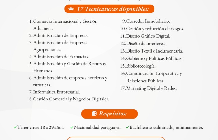 La Secretaría Nacional de la Juventud (SNJ) y el Instituto Técnico Superior Internacional de Encarnación lanzaron la convocatoria de 1.500 becas técnicas virtuales para jóvenes de entre 18 y 29 años.