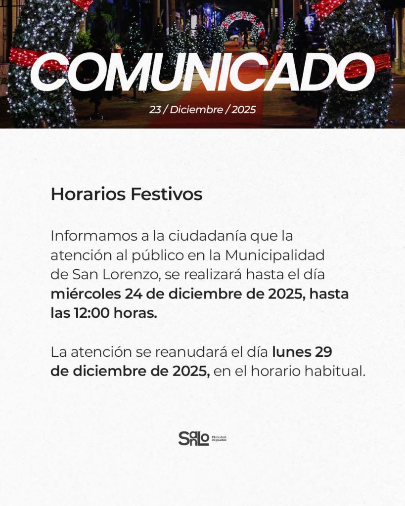 En un breve comunicado, la Municipalidad local informó que atenderá al público en general hasta las 12:00 de este miércoles 24. La atención se reanudará el lunes 29, en su horario habitual.