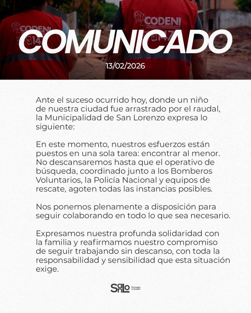 Este viernes el Ejecutivo Municipal emitió un comunicado sobre la desaparición de un niño tras ser arrastrado por un raudal en Tayazuape, en las cercanías de la calle Pachito López, zona de obra municipal. En el anunciando se pone «disposición para seguir colaborando en todo lo que sea necesario» y expresa su «profunda solidaridad con la familia».