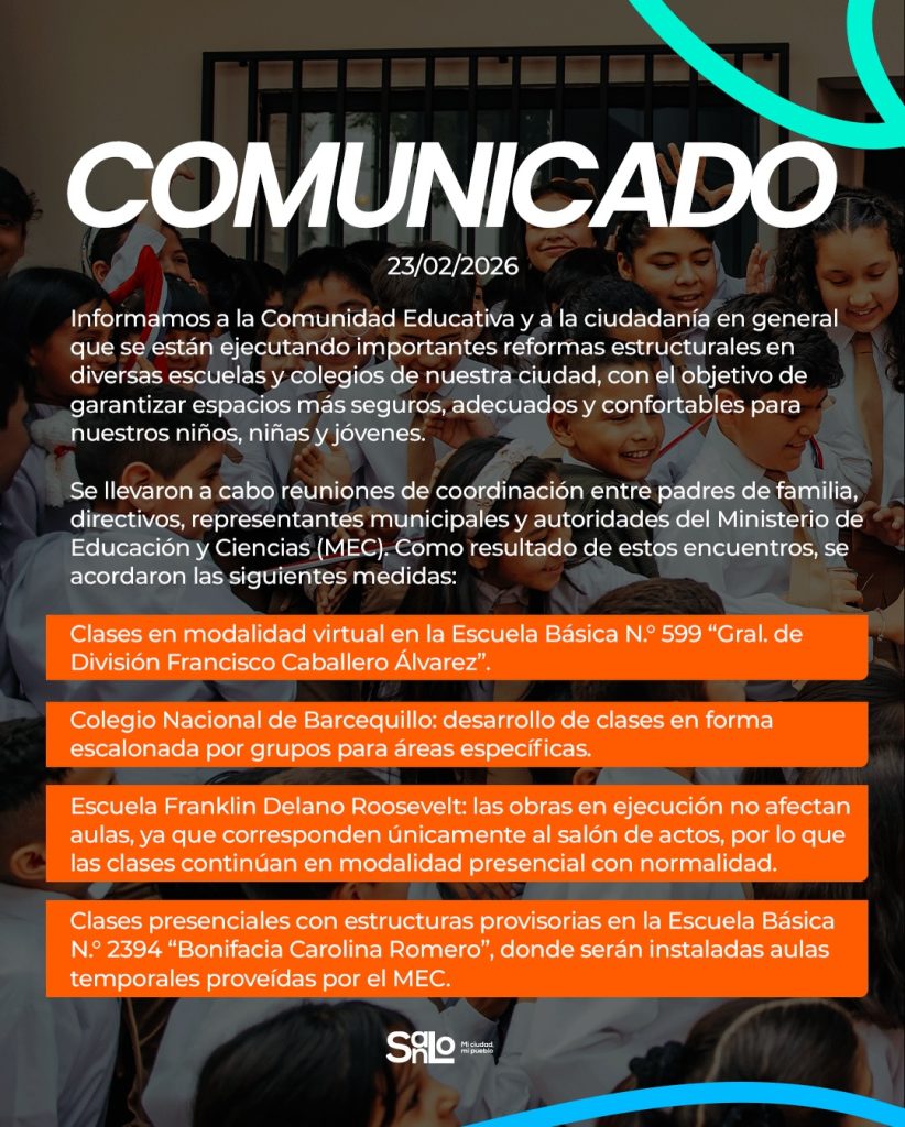 Acordaron que en la escuela Francisco Caballero Álvarez las clases se desarrollarán en la modalidad virtual, y en el Colegio Nacional de Barcequillo las clases serán de forma escalonada por grupos para áreas específicas; mientras en la Escuela Franklin Delano Roosevelt, las obras en ejecución no afectan aulas, ya que corresponden únicamente al salón de actos, por lo que las clases continúan en modalidad presencial. Finalmente, en la escuela Carolina Romero instalaron aulas temporales proveídas por el MEC.
