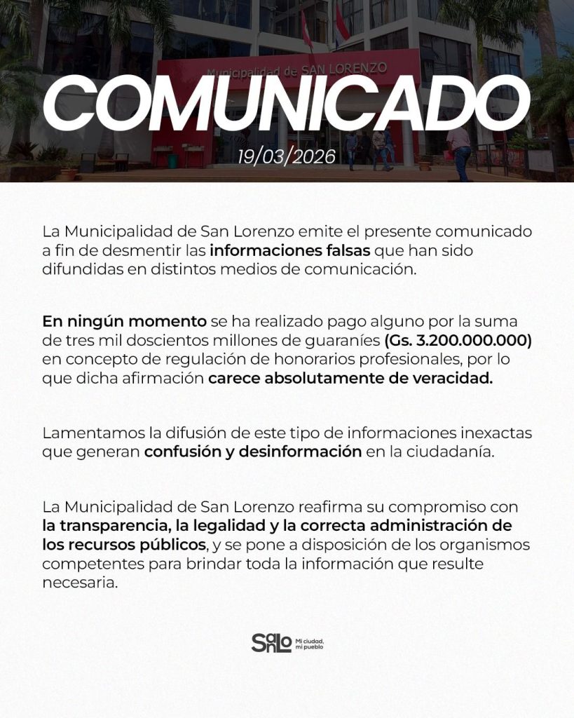 La Municipalidad de San Lorenzo emitió un escueto comunicado para «desmentir las acusaciones falsas» sobre un pago de G. 3.200 millones en concepto de regulación de honorarios profesionales a favor de sus asesores jurídicos por la venta de un inmueble.