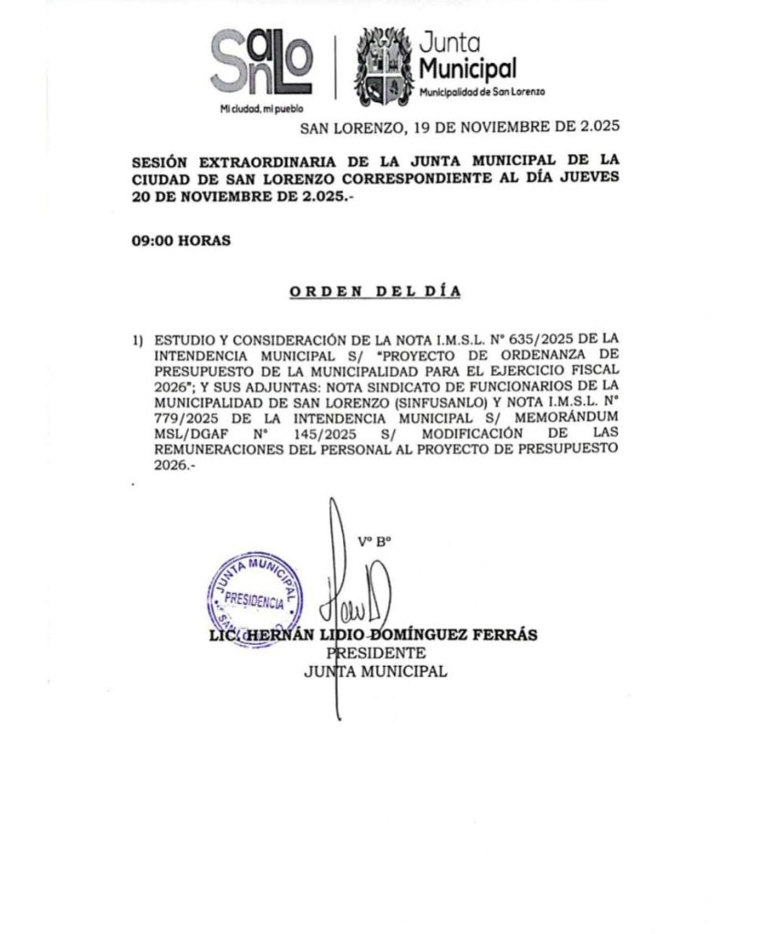 Para las 09:00 está previsto una sesión extraordinaria con el fin de tratar el Proyecto de Ordenanza de Presupuesto de la Municipalidad de San Lorenzo para el Ejercicio Fiscal 2026, y sus adjuntas…